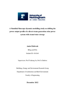 In solar thermal power plants, thermal storage is a critical requirement. There are different types of heat storage systems in solar plants such as molten salts, concretes, phase change materials and steam accumulators. The steam accumulator has been adopted in Planta Solar 10 project. Steam accumulator is a viable option for decreasing the influence of changing irradiance on the power generation of solar thermal systems since they have fast reaction time and high discharge rates due to the rapid evaporation and condensation of water/steam under non-equilibrium conditions. This thesis aims to study the dynamic behaviour of a novel direct steam generation solar power system integrated with a steam/water accumulator for shifting its power output profile to match the electricity demand profile in a Libyan hospital as a case study.