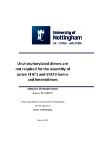 STATs are latent signalling proteins and transcription factors that are activated by phosphorylation upon ligand binding to cytokine receptors. All seven mammalian STATs form dimers upon activation. So far, research focused on homodimers, but it is now recognised that some STATs can also form heterodimers. Yet, it is unclear what determines the formation of individual dimer types, especially when multiple STATs get activated simultaneously. Several STATs assemble inactive, unphosphorylated dimers. However, their structure is different from the active signalling complex. Therefore, it is conceivable that unphosphorylated STAT dimers may regulate the composition of active signalling complexes. This would mean that activated complexes arise from a pre-defined pool of unphosphorylated STAT homo- and heterodimers via a cytokine-induced change in dimer conformation. Alternatively, active signalling complexes may form independent of their unphosphorylated counterparts. This work describes two new cell-based assays and their application with a focus on STAT1 and STAT3, whose capability to form active heterodimers is relatively well characterised, to test these alternatives. Firstly, the Nuclear Translocation Assay is based on the ability of STATs to accumulate inside the nucleus after cytokine treatment. This phenotype is mediated by a nuclear localisation signal (NLS) sequence and can be disrupted by mutation. It was found here that said mutation is dominant-negative for STAT1, STAT3 and STAT5B nuclear import. Therefore, it is possible to assess active dimer formation between an accumulation mutant and another STAT by observing their cytokine-induced nuclear accumulation pattern. If the two proteins form active dimers, cytokine-induced nuclear accumulation of both is diminished. In turn, if they do not form active dimers, cytokine-induced nuclear accumulation is diminished for the mutant but not the other STAT. In the Nuclear Translocation Assay, this effect is made visible in live-cell microscopy by fusing the putative interaction partners with different fluorescent proteins. Testing several STAT1 and STAT3 wild-types and mutants, that disrupt the unphosphorylated but not active dimers, using this assay revealed that active homo- and heterodimers formed independent of their unphosphorylated counterparts. Secondly, the Co-localisation Assay was used to assess the formation of unphosphorylated dimers between different STATs. The assay takes advantage of the observation that unphosphorylated STATs shuttle to and from the nucleus constitutively and that the balance of this can be altered in favour of either the nucleus or cytoplasm by fusion with an external signal sequence. If a certain baitSTAT fusion protein can form latent dimers with a co-expressed test-STAT, then both proteins co-localise in the targeted compartment as visualised by different fluorescent protein tags. If not, then co-localisation is diminished. Applying this to STAT1 and STAT3 revealed that both paralogues readily formed unphosphorylated homodimers but not heterodimers. Overall, the findings from both assays suggest that active STAT1 and STAT3 homo- and heterodimer formation is independent of prior assembly as unphosphorylated dimers. Furthermore, the evidence presented here suggests that their homo- and heterodimers may form at equal rates.