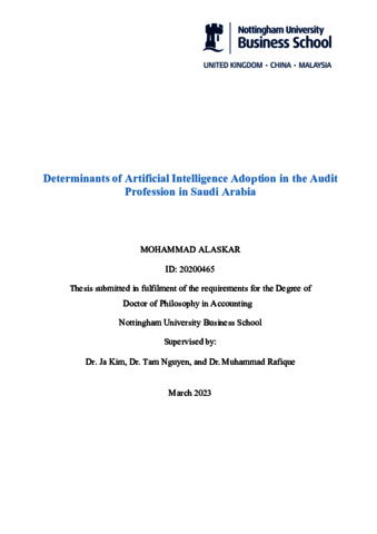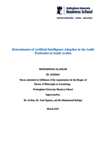 Determinants of artificial intelligence adoption in the audit profession in Saudi ArabiaTools Alaskar, Mohammad (2023) Determinants of artificial intelligence adoption in the audit profession in Saudi Arabia. PhD thesis, University of Nottingham.