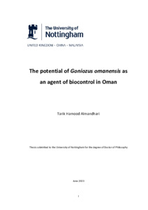 Almandhari, Tarik Hamood Mohammed (2023) The potential of Goniozus omanensis as an agent of biocontrol in Oman. PhD thesis, University of Nottingham.