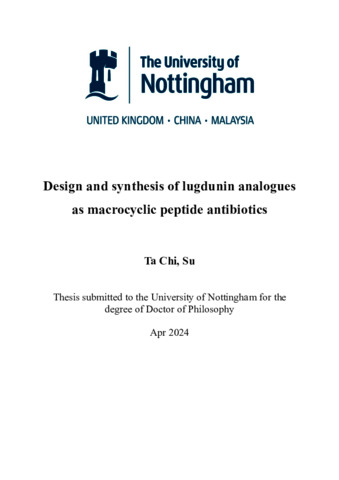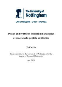 Design and synthesis of lugdunin analogues as macrocyclic peptide antibioticsTools Su, Ta-Chi (2024) Design and synthesis of lugdunin analogues as macrocyclic peptide antibiotics. PhD thesis, University of Nottingham.