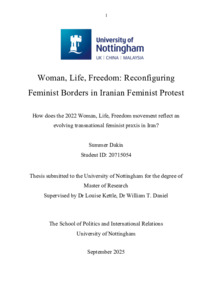 Woman, life, freedom: reconfiguring feminist borders in Iranian feminist protest: how does the 2022 woman, life, freedom movement reflect an evolving transnational feminist praxis in Iran?Tools Dakin, Summer (2025) Woman, life, freedom: reconfiguring feminist borders in Iranian feminist protest: how does the 2022 woman, life, freedom movement reflect an evolving transnational feminist praxis in Iran? MRes thesis, University of Nottingham.