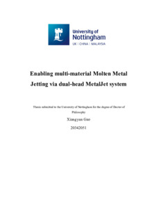 Enabling multi-material Molten Metal Jetting via dual-head MetalJet systemTools Gao, Xiangyun (2025) Enabling multi-material Molten Metal Jetting via dual-head MetalJet system. PhD thesis, University of Nottingham.