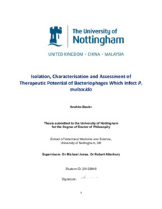 Isolation, characterisation and assessment of therapeutic potential of bacteriophages which infect P. multocidaTools Besler, Ibrahim (2025) Isolation, characterisation and assessment of therapeutic potential of bacteriophages which infect P. multocida. PhD thesis, University of Nottingham.