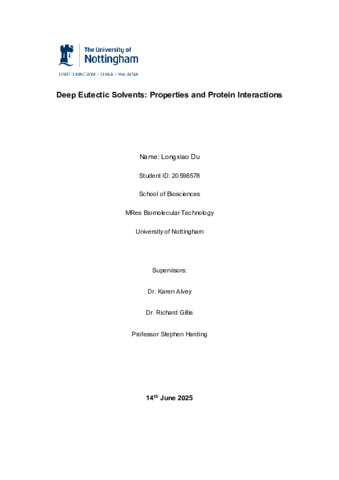 Du, Longxiao (2025) Deep Eutectic Solvents: Properties and Protein Interaction [Part A] BSA in Urea-Sarcosine DES: Solubility, Aggregation, and Storage Stability [Part B]. MRes thesis, University of Nottingham.