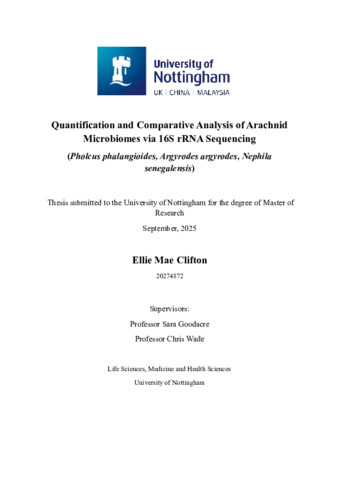 Clifton, Ellie Mae (2025) Quantification and Comparative Analysis of Arachnid Microbiomes via 16S rRNA Sequencing (Pholcus phalangioides, Argyrodes argyrodes, Nephila senegalensis). MRes thesis, University of Nottingham.