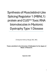 Synthesis of Muscleblind-Like Splicing Regulator 1 (MBNL1) protein and CUGexp toxic RNA biomolecules in Myotonic Dystrophy Type 1 diseaseTools Waugh, Christopher (2025) Synthesis of Muscleblind-Like Splicing Regulator 1 (MBNL1) protein and CUGexp toxic RNA biomolecules in Myotonic Dystrophy Type 1 disease. MSc(Res) thesis, University of Nottingham.